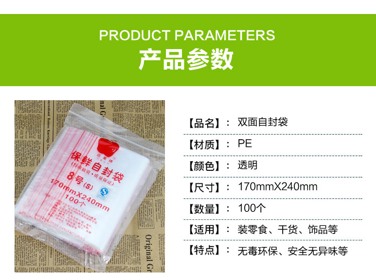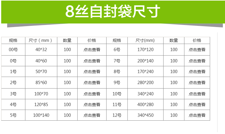 紅色外包裝)厚度為單面4絲 雙面8絲 每包數(shù)量100個 可能會發(fā)生正負(fù)差(0-4號可能差別大一點(diǎn) 5-12號差別很小 5號以上差別幾率很小)